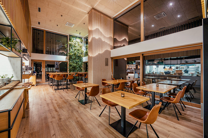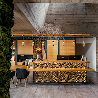 A private wine room with a fireplace, located next to the main hotel building, is lined with natural wood and offers the possibility of holding various corporate and private events. Its outdoor part also includes a summer kitchen with several types of grills. A private wine cellar is available to guests, and live music can be provided if interested. The capacity of the wine bar is designed for 35 people.