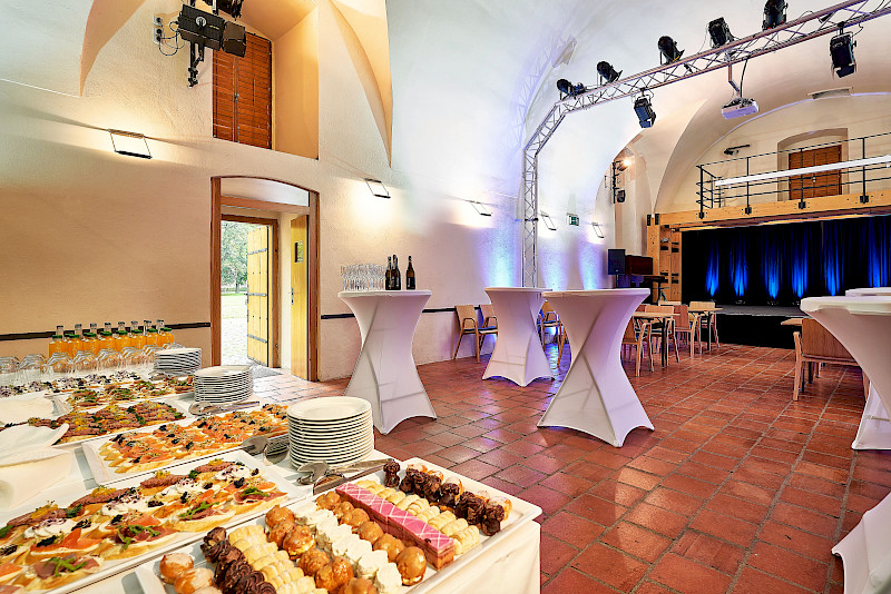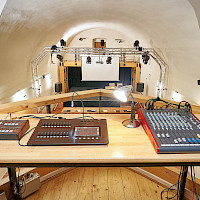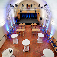 The hall with a capacity of up to 100 people or 80 people in a theater setting is equipped with a stage, high-quality lighting and sound equipment, a projector and a projection screen. In a table setting, the capacity is reduced to 20 to 30 people depending on the layout of the tables and the orientation of the seated people. A café setting is also possible in cooperation with verified suppliers, with whom catering can also be arranged (Café Bistro Citadela, Holiday Inn catering).