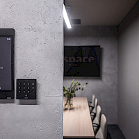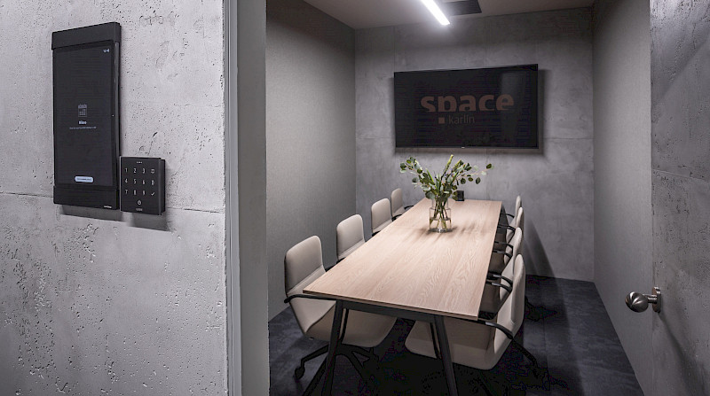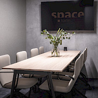 A meeting room for 8 people with comfortable chairs, a large screen and soundproof walls. A great place for strategic meetings and creative discussions.