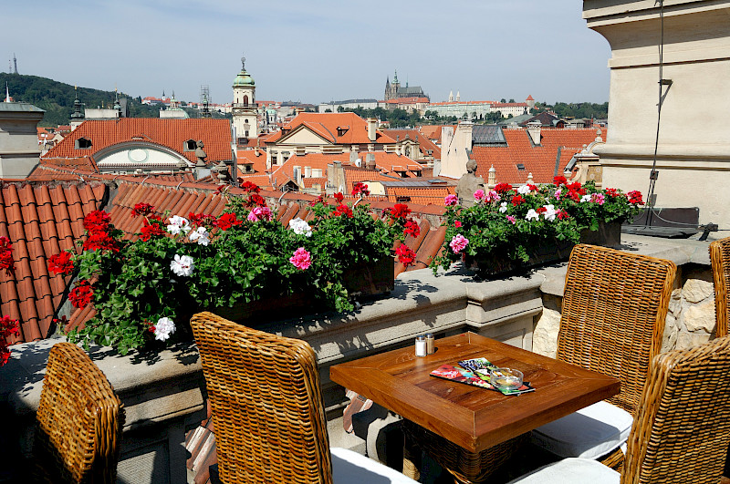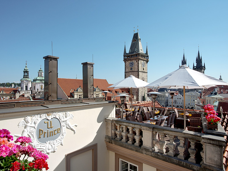 A terrace with a breathtaking view of the Old Town Square and the roofs of old Prague