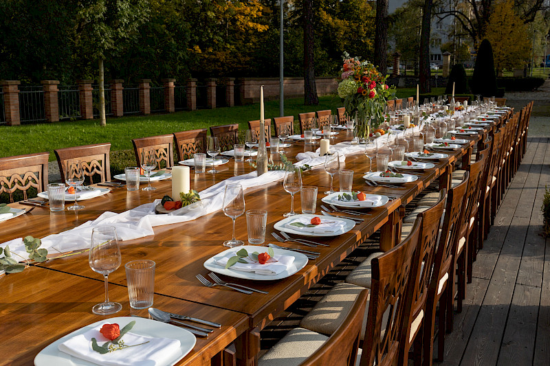 We also have a large outdoor seating area with 200 seats, located in the middle of a romantic park with a pond. And not only for that reason, it is widely used for organizing wedding receptions. For wedding guests, it is possible to arrange a feast with a ceremony.