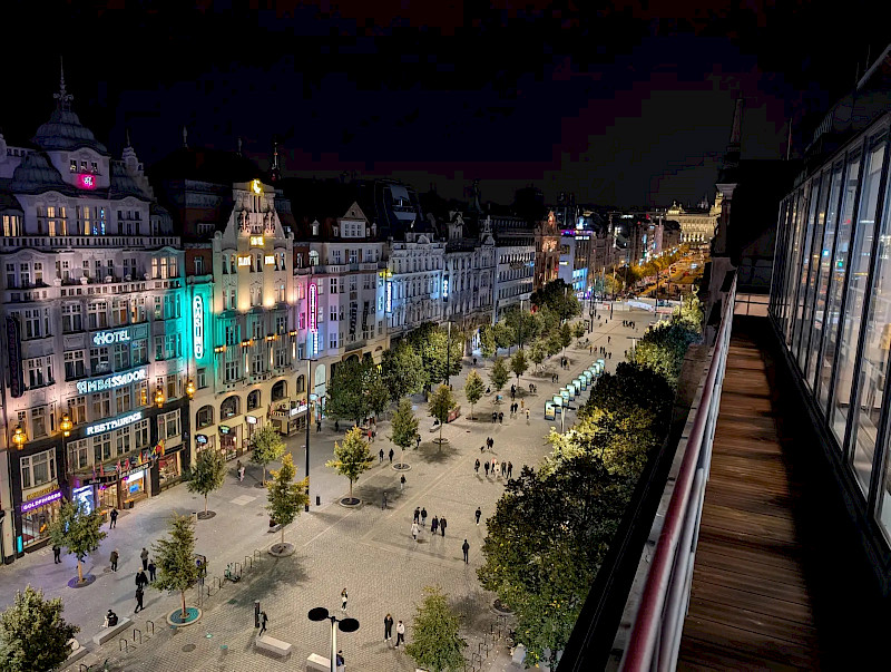 From the 7th floor of the iconic Bať Palace, you will have an impressive view directly onto the busy Wenceslas Square, where you can fully experience the pulsating atmosphere of the great city of Prague.
