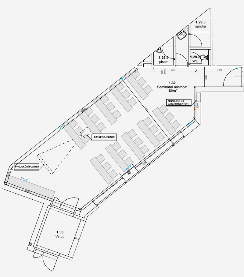 Seminární místnost je součástí přístavby ke společenskému sálu s kapacitou 20-30 osob. Je vhodná pro menší semináře, školení, workshopy, případně oslavy atd. Lze ji využít spolu se společenským sálem jako další prostor při organizaci akcí. Seminární místnost disponuje vlastním sociálním zázemím včetně sprchového koutu a také technickým vybavením (dataprojektor, plátno, flipchart, wi-fi).
