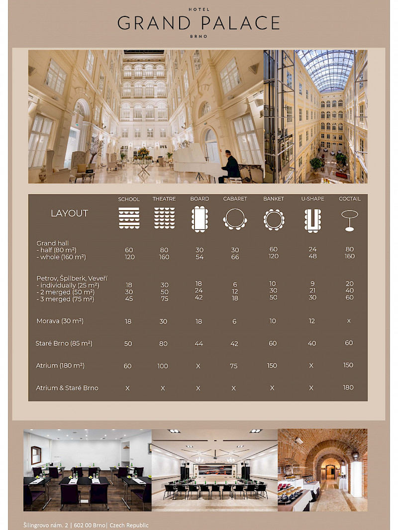 Pro speciální akce, prezentace luxusních produktů, módní přehlídky či gala večery je k dispozici unikátní multifunkční prostor hotelového atria.