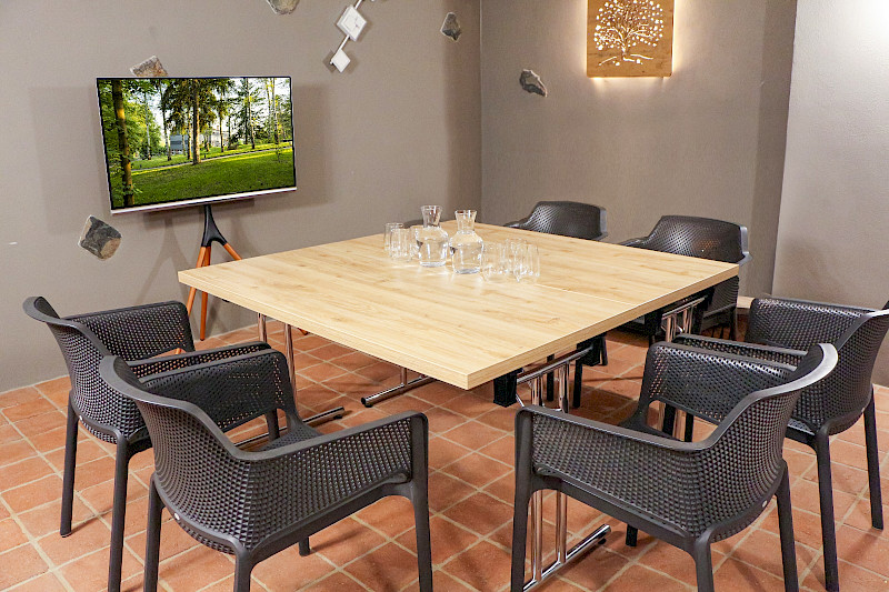 Kapacita: 15 os. divadelní | 10 os. banketní | 10 os. školní | 10 os. ženevské | 10 os. "T" | 10 os. zasedací | 10 osob "I" Cena: cena 1000 Kč bez DPH / hodina Popis a vybavení: 26 m2 v suterénu, bez oken, avšak s kvalitní vzduchotechnikou bez přístupu ke kvalitnímu mobilnímu signálu kompletní vybavení v ceně pronájmu smart Tv, flipchart a fixy, stabilní internetové připojení konektivita je zajištěna formou HDMI 2.0 • 2× USB 2.0 • Cl slot