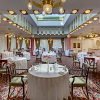 Světlý a nově zrekonstruovaný restaurant Hradčany s otevíratelnou střechou.