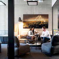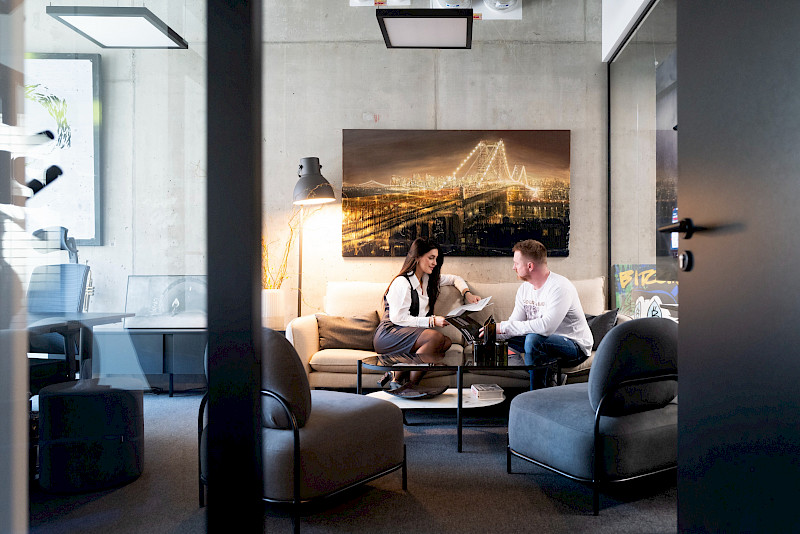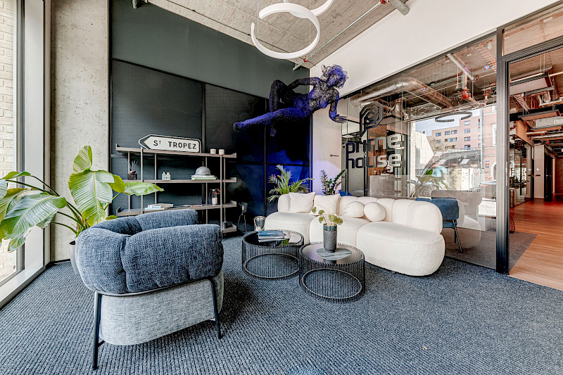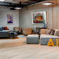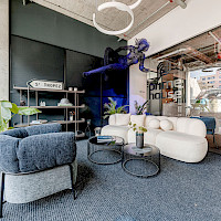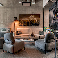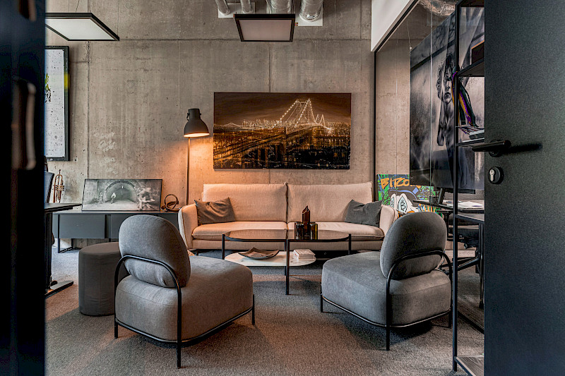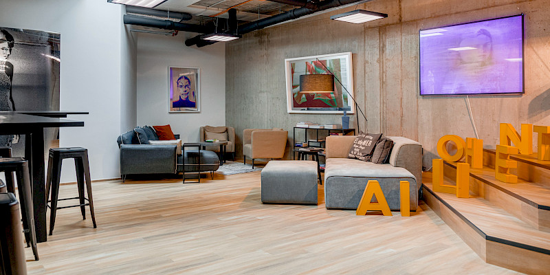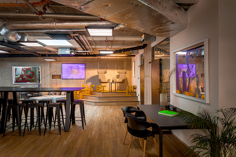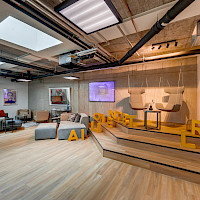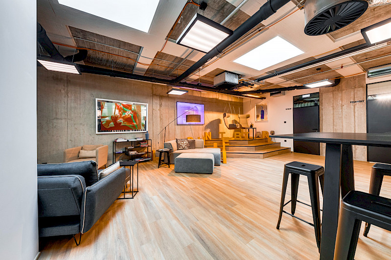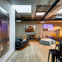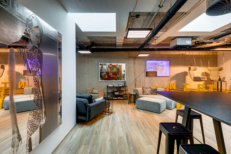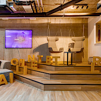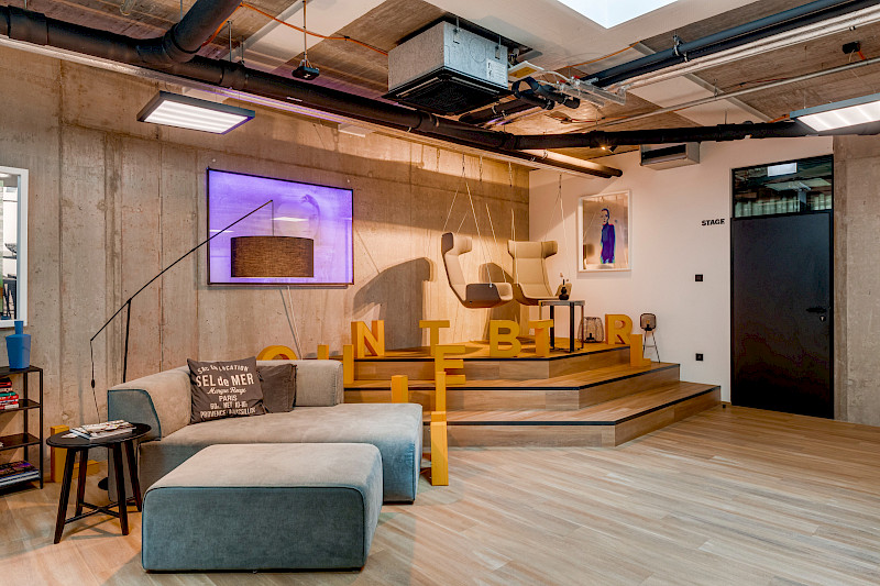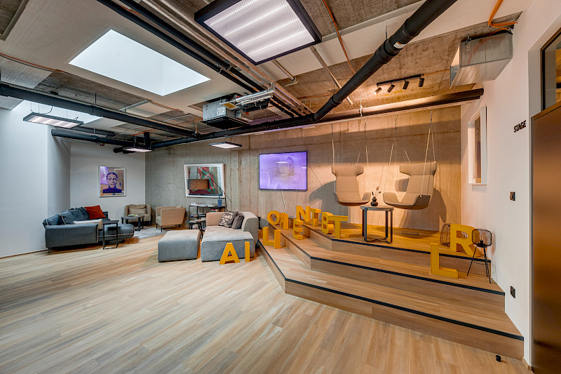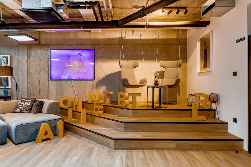 Různorodé zóny: od pohodlných sedaček a křesel, přes pracovní stoly až po vyvýšenou “stage” s designovými zavěšenými křesly.